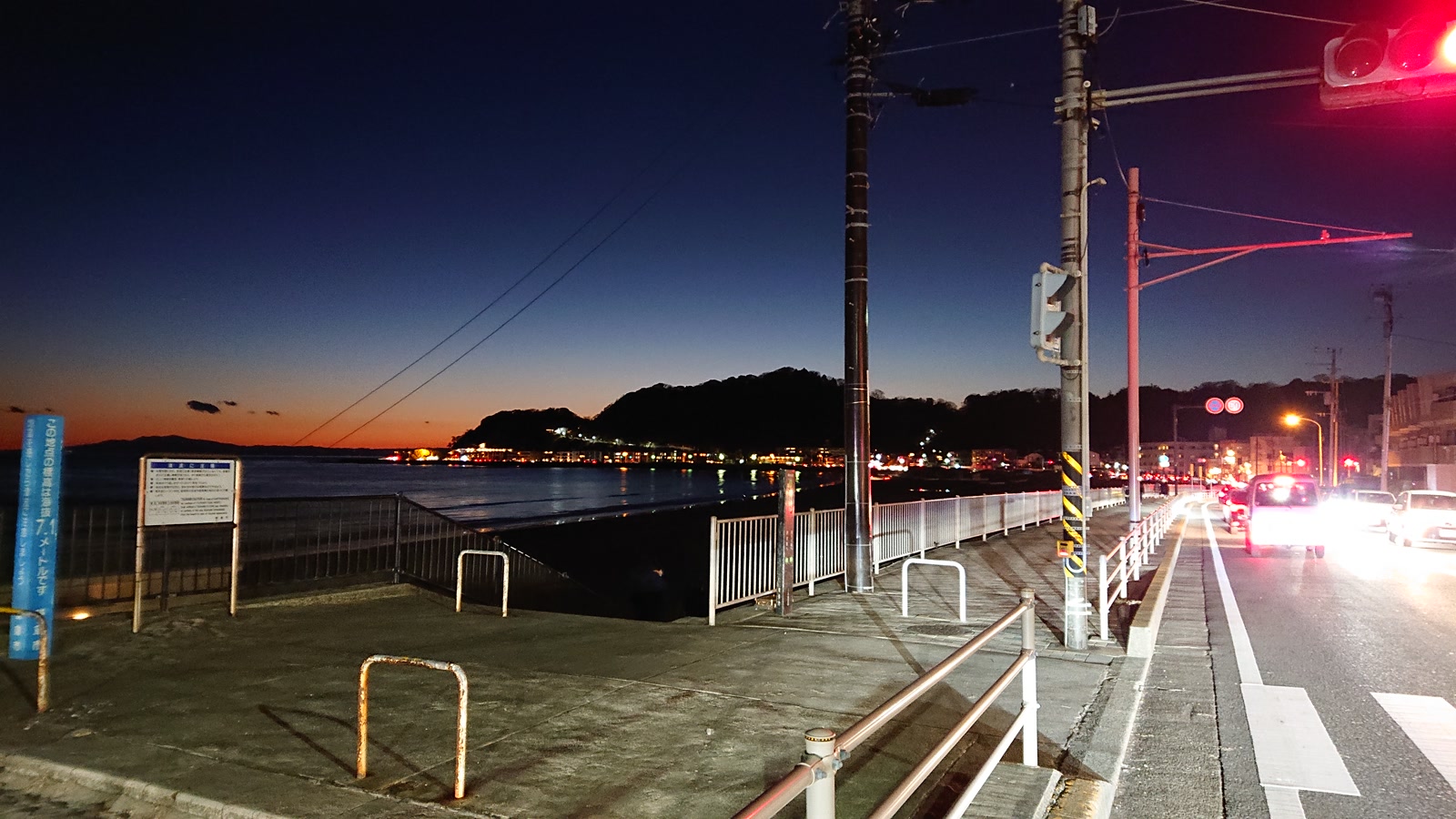 「ここから先はそもそも道の選択肢があまりないのでもう迷わないはず」と思っていたんですが、帰り道をばっちり間違えて無駄に走り回っていたら夜になっちゃいました。由比ヶ浜から見る稲村ヶ崎のシルエットがキレイです