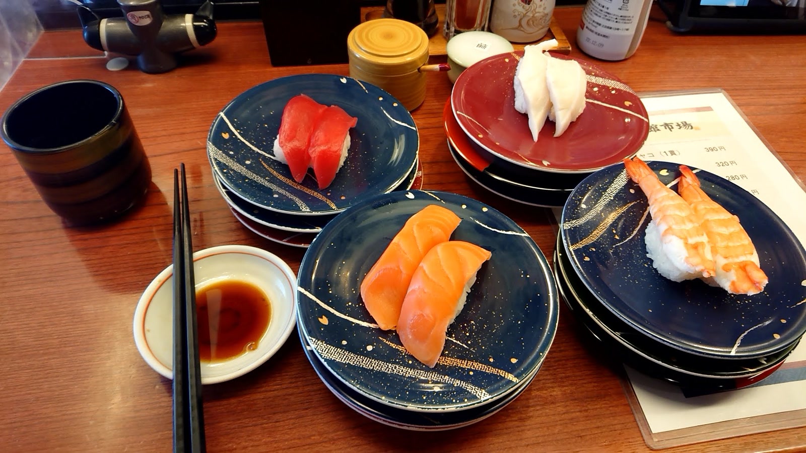 お昼を過ぎたところで回転寿司屋さんが見えたので入ってみます