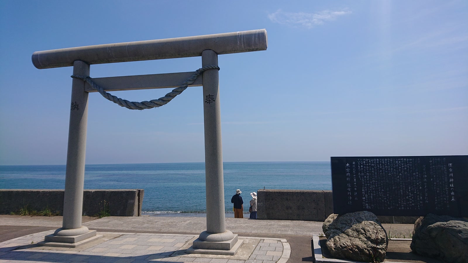 まっすぐに海まで行くと鳥居が見えてきました。佐女川神社という神社さんの鳥居なんだそうです。この浜では御神体を抱えて海に入り御神体を清める「寒中みそぎ祭り」というお祭りを毎年1月にするんだそうです。1月は相当寒いと思うんですが心臓が止まったりしないんでしょうか