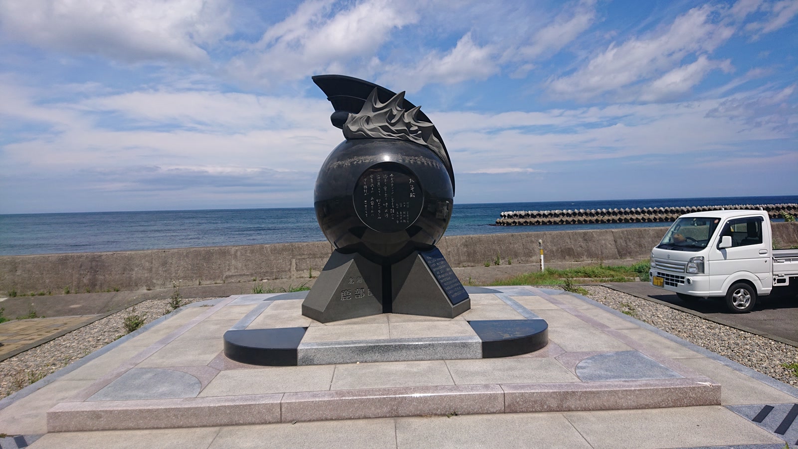 この日は強い西風が吹いていて平坦路なのになかなか進まなくて苦しみましたがようやく鹿部まで到着。道の駅鹿部の向かいにあったこのモニュメントは「北斗船」という演歌のヒット曲の歌碑なんだそうです。Youtubeに映像があったので聴いてみましたが漁師さんの歌なのかな?