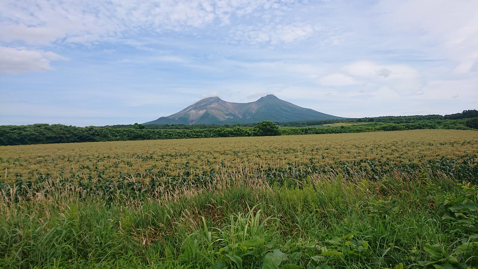 とうもろこし畑の向こうに北海道駒ヶ岳が見えます